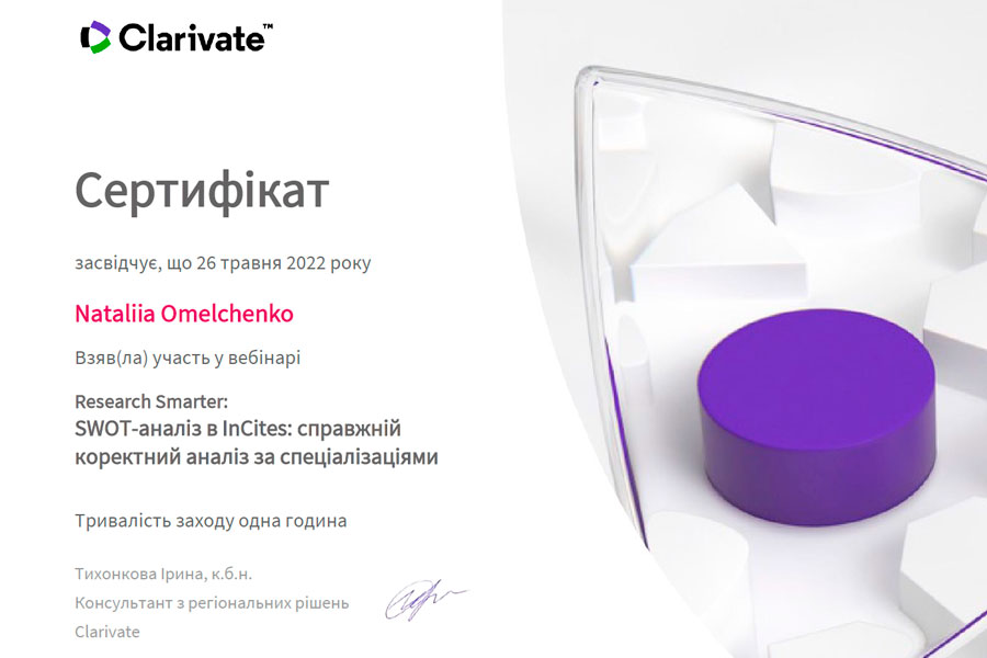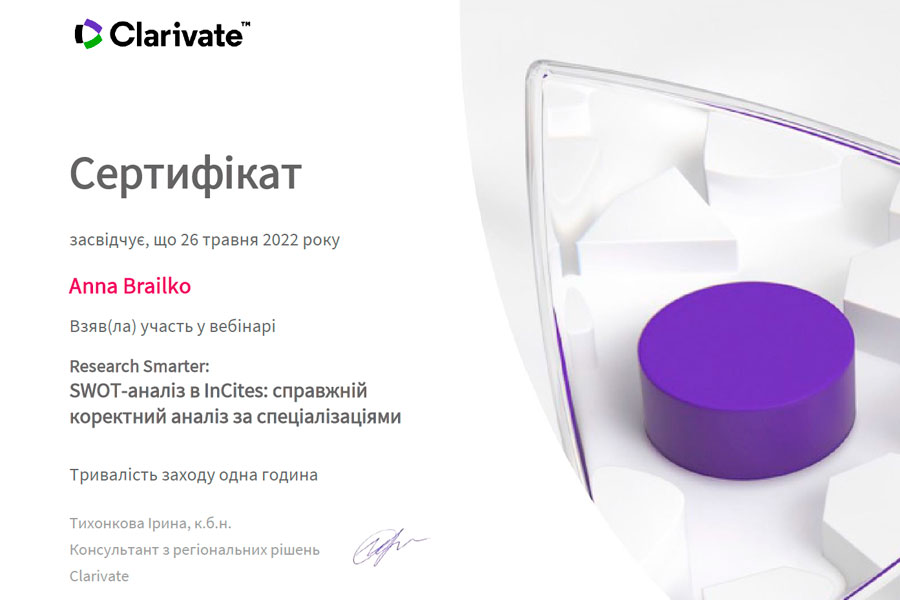 По завершенню заходу викладачі університету отримали сертифікати від Clarivate, який є власником і виробником потужних ресурсів та інструментів, що допомагають науковцям проводити, аналізувати, презентувати наукові дослідження на світовому рівні.