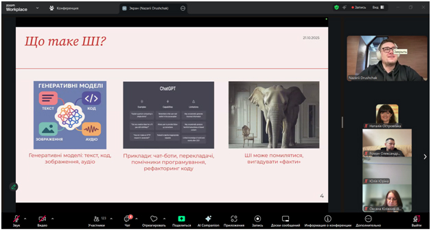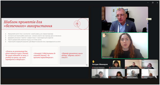 Під час заходу учасники ознайомилися з принципами етичного використання сучасних технологій у навчанні та дослідженнях, отримали рекомендації щодо інтеграції ШІ у освітній процес, не порушуючи стандартів академічної доброчесності, а також обговорили практичні аспекти застосування штучного інтелекту у підготовці навчальних та наукових матеріалів.