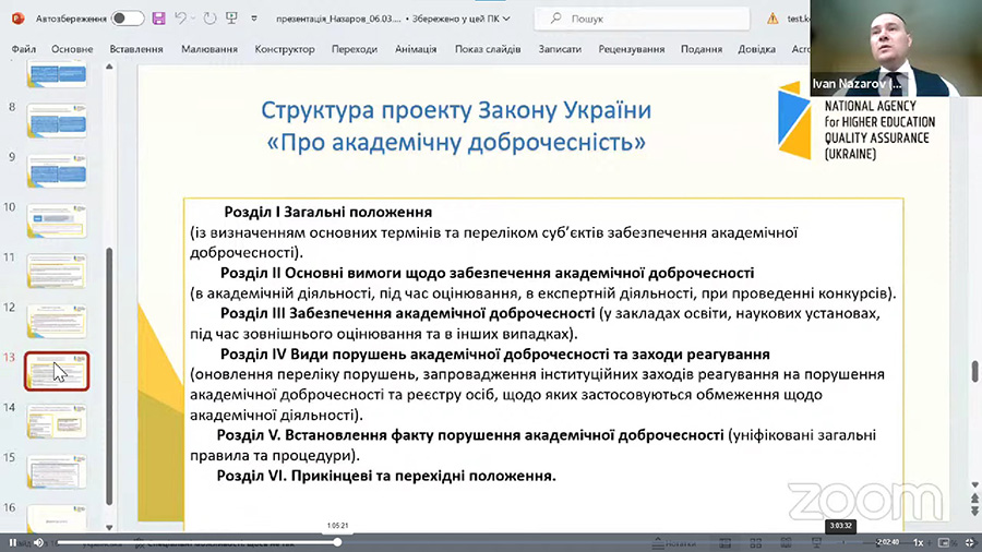 Спікерами заходу виступили: Іван НАЗАРОВ, доктор юридичних наук, професор, заступник голови Національного агентства із забезпечення якості вищої освіти з доповіддю «Проблеми застосування та вдосконалення законодавства щодо забезпечення академічної доброчесності»;Володимир БАХРУШИН, доктор фізико-математичних наук, професор НУ «Запорізька політехніка», член Національної команди експертів з реформування вищої освітирозповів «Навіщо потрібна академічна доброчесність?»;Євген НІКОЛАЄВ, директор Аналітичного центру «ОсвітАналітика» Університету Грінченка виступив на тему: «Актуальні виклики для академічної доброчесності на початку 2024 року»; Руслан КУЛИКОВСЬКИЙ, канд. тех. наук, доцент, проректор НУ «Запорізька політехніка»виступив з доповіддю «Генеративний штучний інтелект та академічна доброчесність. Світові тенденції».За результатами семінару учасники від університету успішно пройшли тестування та отримали сертифікат у обсязі 0,5 ЄКТС.