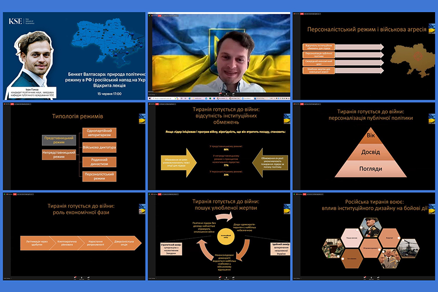 15 червня здобувачі вищої освіти бакалаврату, магістратури та рівня PhD спеціальності 052 «Політологія» разом з викладачами кафедри політології та правознавства долучилися до відкритої лекції Івана Гомзи, кандидата політичних наук, завідувача кафедри публічного врядування Київської школи економіки на тему: «Бенкет Валтасара: природа політичного режиму в РФ і російський напад на Україну».