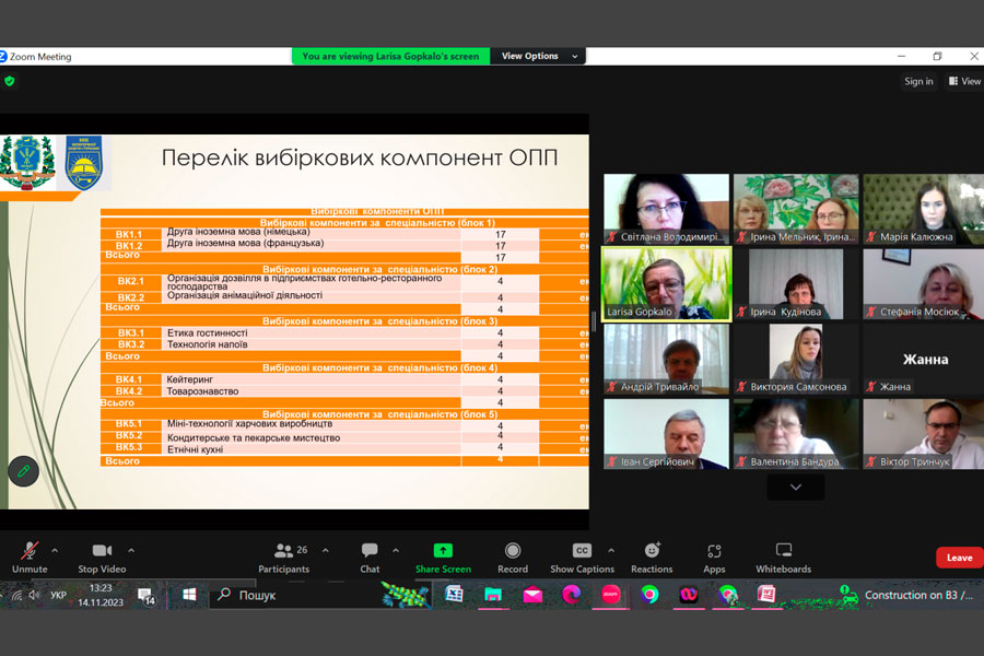 Про важливість врахування практико-орієнтованої складової під час підготовки здобувачів другого (магістерського) рівня вищої освіти зазначила гарант програми, завідувачка кафедри готельно-ресторанної справи та туризму, модератор заходу Світлана Мельниченко. Вона відмітила про нові підходи щодо формування змістовної частини освітньої програми обумовлені потребами ринку в нових кадрах, що уміють вирішувати проблеми, креативно мислити, використовувати інноваційні цифрові технології, бути емоційно стійкими та клієнтоорієнтованими. Започаткування та реалізація даної освітньої програми спрямована на підготовку фахівців здатних ідентифікувати та розв’язувати складні задачі і проблеми, що передбачають проведення досліджень, організацію сервісної та інноваційної діяльності суб’єктів готельно-ресторанного бізнесу з метою прийняття ефективних рішень в умовах невизначеності та з урахуванням еко-трендів. При формуванні освітньої складової враховано, у тому числі, і специфіку Національного університету біоресурсів і природокористування України. Було представлено досвід формування освітніх програм за даною спеціальністю вітчизняними та закордонними закладами вищої освіти і можливість врахування найкращих європейських практик.