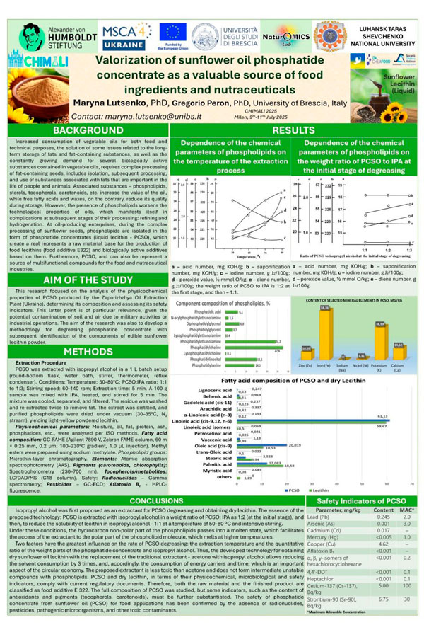 З 9 по11 липня 2025 року на базі Міланських університетів Бікокка та Ca' Granda відбувся XIV Національний конгрес з харчової хімії (https://chimali.it/), в якому Марина Луценко взяла участь зі стендовою доповіддю на тему: «Валоризація фосфатидного концентрату соняшникової олії як цінного джерела харчових інгредієнтів та нутрицевтиків».