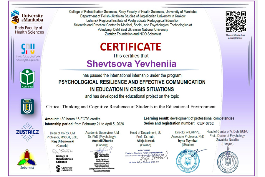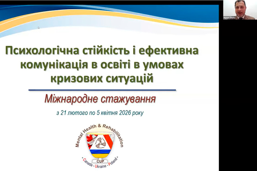 У період з 21 лютого по 5 квітня викладачі факультету соціальних і гуманітарних наук – Артем Галич, Олена Кравченко, Ольга Куцевська, Катерина Котеленець та Євгенія Шевцова проходили міжнародне стажування «Психологічна стійкість і ефективна комунікація в освіті в умовах кризових ситуацій» (Канада – Україна – Польща).