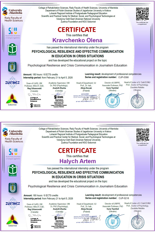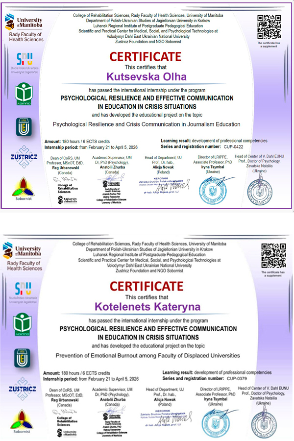 За результатами стажування викладачі отримали сертифікати міжнародного зразка (180 годин / 6 кредитів ЄКТС), підтвердивши проходження підвищення кваліфікації відповідно до встановлених вимог. У межах програми було розроблено та апробовано практичні напрацювання, зокрема моделі психологічної стійкості та елементи кризової комунікації, які впроваджуються в освітній процес і навчально-методичне забезпечення та сприяють підвищенню якості викладання на факультеті.