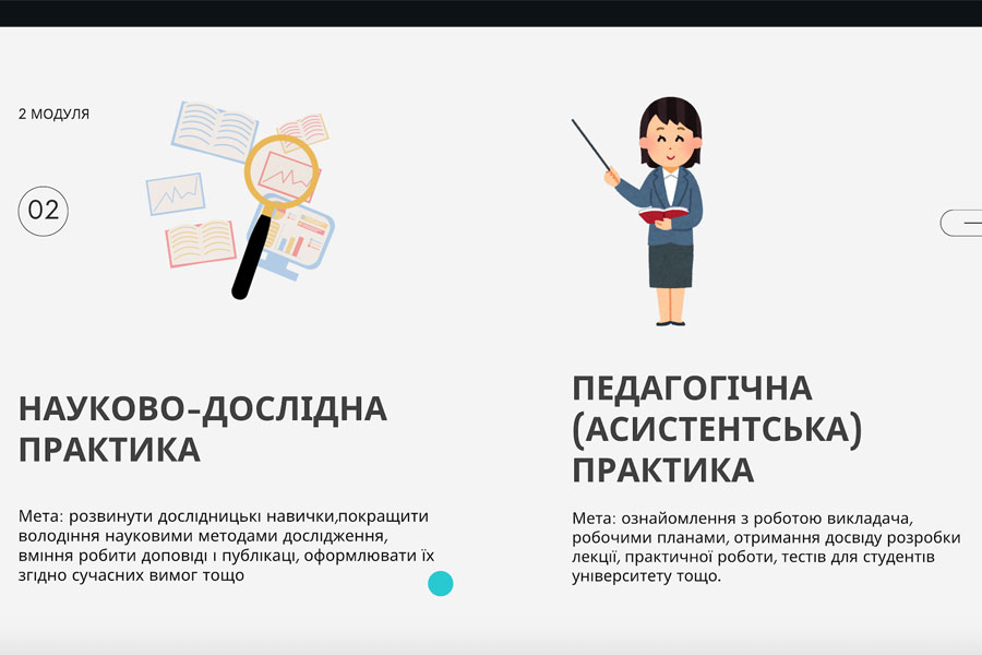 Науково-педагогічна практика складається з двох частин: 1) науково-дослідної практики та 2) асистентської практики. Мета науково-педагогічної практики – підвищення науково-педагогічного рівня здобувачів вищої освіти освітньої галузі 01 Освіта/Педагогіка шляхом набуття професійних навичок, вмінь проведення самостійної наукової-дослідної роботи та опанування педагогічної майстерності на посаді асистента викладача закладу вищої освіти. Важливими завданнями практики є розвиток навичок та вмінь інформаційно-аналітичної, науково-дослідницької діяльності, опанування методики проведення географічних та педагогічних досліджень.