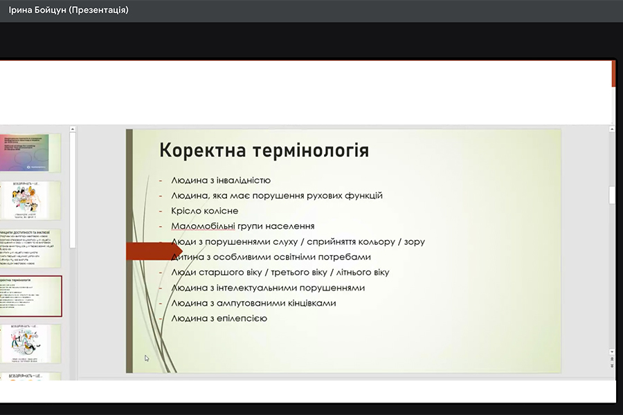 Спікерка вебінару, заступниця директора з соціально-гуманітарної роботи ННІФІЖ Ірина Бойцун ознайомила присутніх з цільовими напрямами Стратегії безбар’єрності, що спрямована на забезпечення доступності й адаптивності для всіх соціальних груп населення незалежно від віку, стану здоров’я, статі, місця проживання та інших ознак, акцентувала на коректності у спілкуванні й використанні термінів тощо.