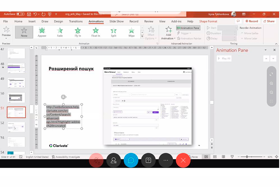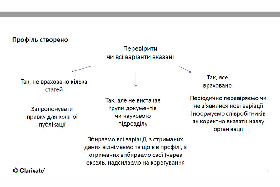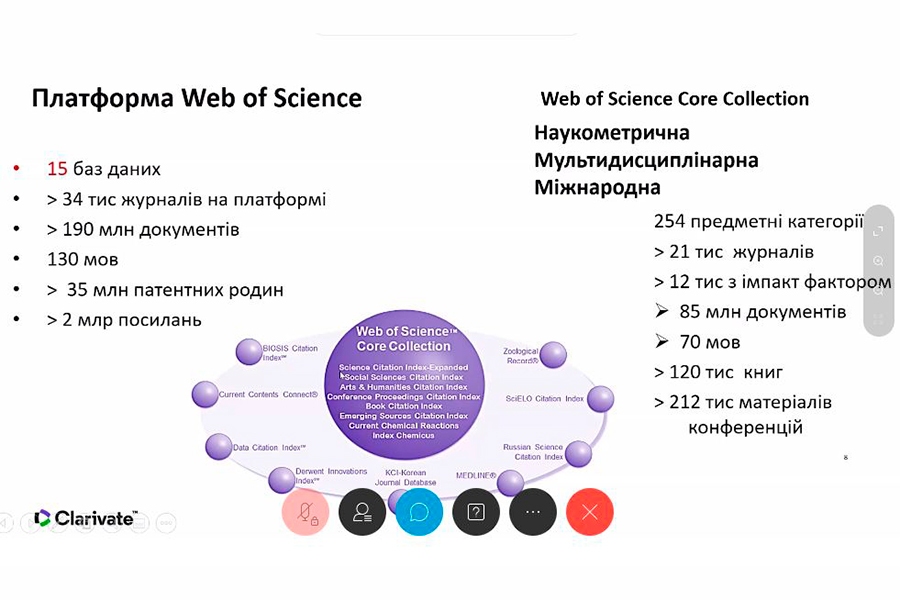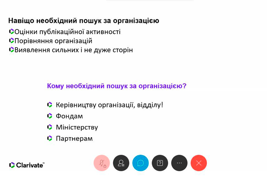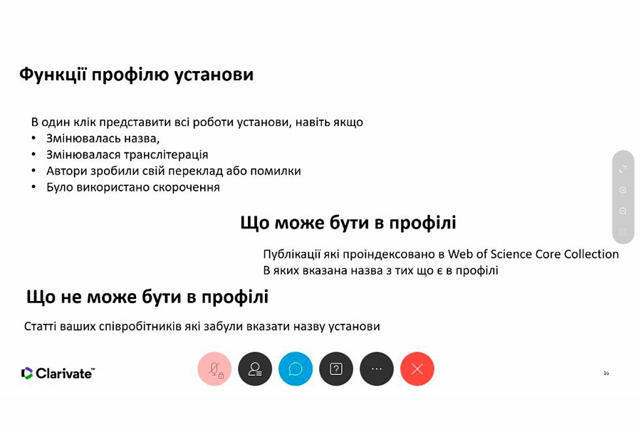 Протягом вебінару було акцентовано увагу на тому, як створювати та підтримувати в актуальному стані профіль закладу вищої освіти у Web of Science Core Collection.