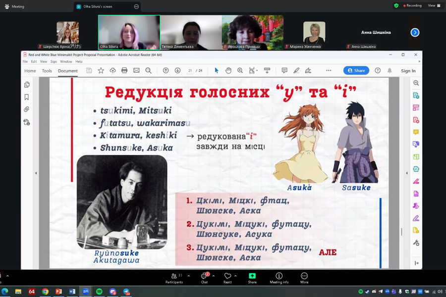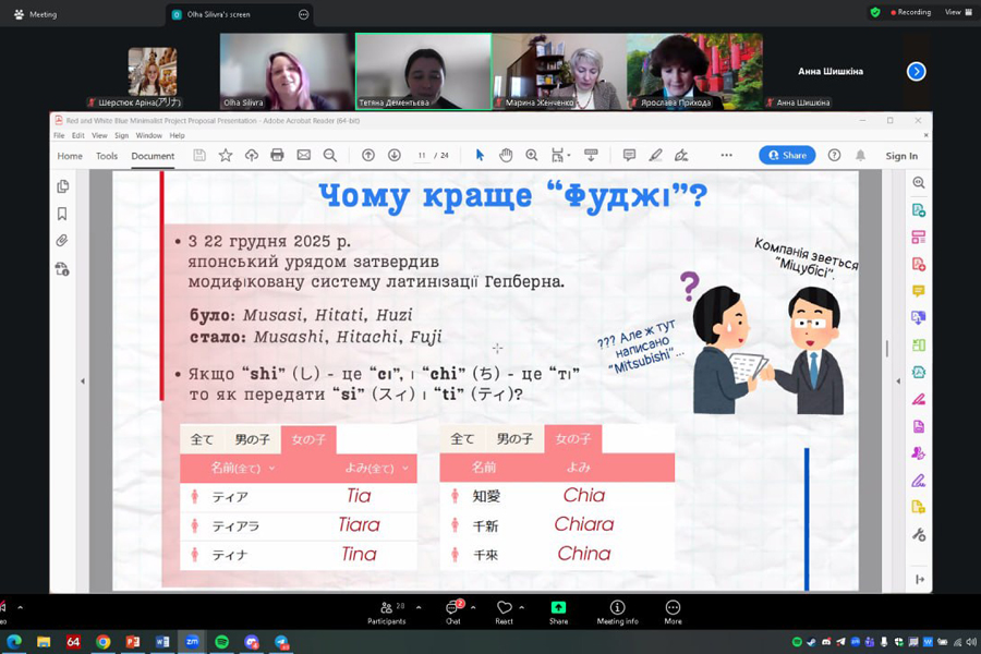 У межах вебінару було розглянуто такі ключові питання: історія формування японсько-українських транскрипційних систем; особливості передачі японських фонем засобами української графіки; варіативність транскрипції в різні історичні періоди; проблема нормалізації написання японізмів в українській мові; практичні рекомендації щодо використання сучасних транскрипційних стандартів.