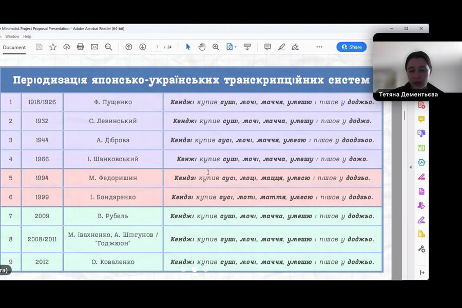 У доповіді було представлено періодизацію японсько-українських транскрипційних систем (від праць Ф. Пущенка 1920-х років до сучасних систем початку XXI століття). Було продемонстровано еволюцію підходів до передачі японських звуків. Під час вебінару відбулося активне обговорення проблем стандартизації транскрипції.