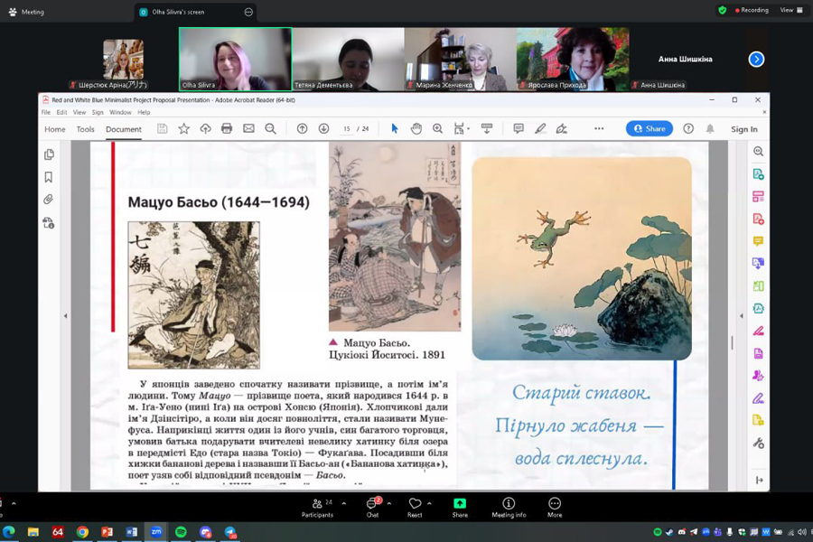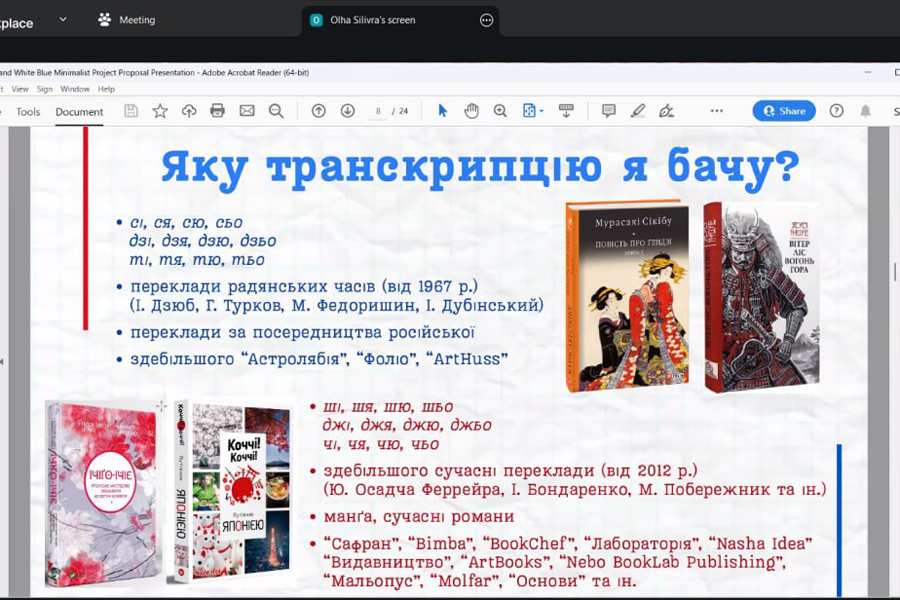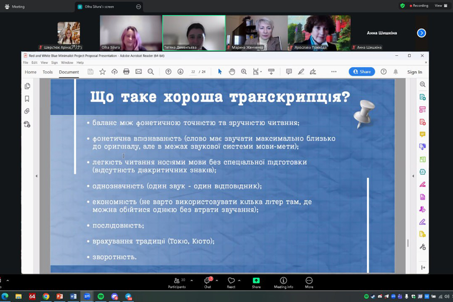 Здобувачі освіти, що вивчають японську мову, разом із гарантом освітньої програми Юлією Малаховою 26 березня відвідали вебінар, присвячений проблемам практичної японсько-української транскрипції, її історичному розвитку та сучасним підходам до передачі японських власних назв і реалій українською мовою. Лекторками були японістки, перекладачки Ольга Сілівра та Тетяна Дементьєва.