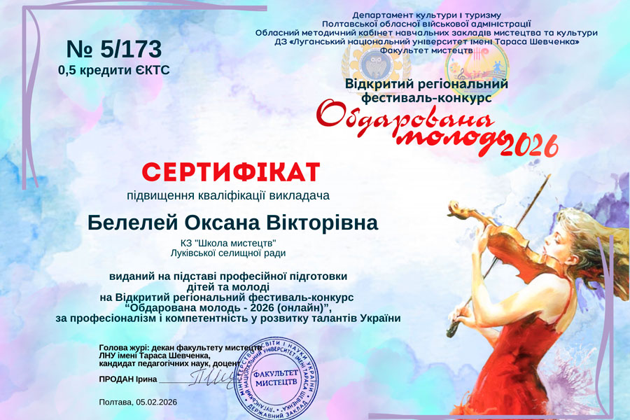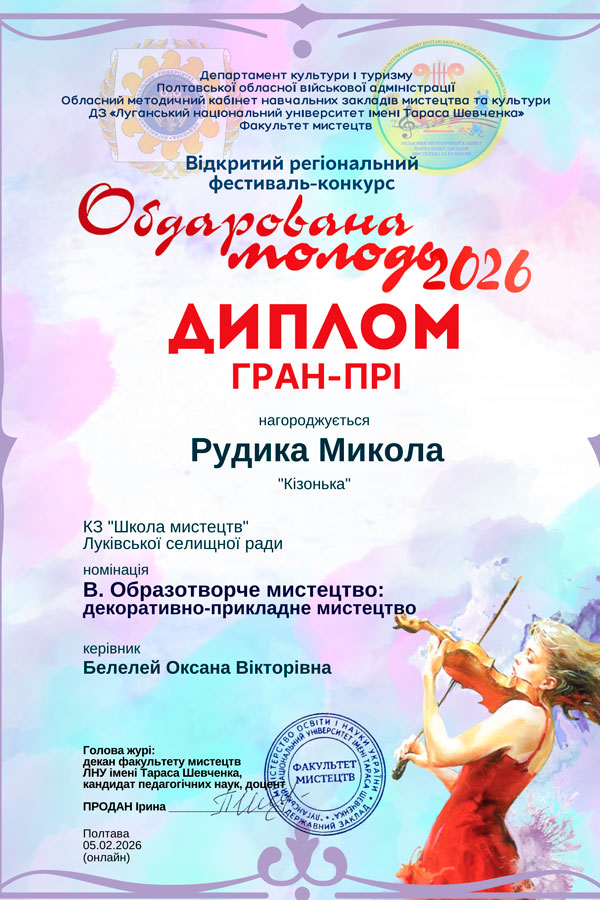 Із грудня 2025 р. по лютий 2026 р. тривав Відкритий регіональний фестиваль-конкурс «Обдарована молодь – 2026» (онлайн), який традиційно проходить на факультеті мистецтв ЛНУ імені Тараса Шевченка. В цьому навчальному році конкурс проходив за підтримки Обласного методичного кабінету навчальних закладів мистецтва та культури Полтавської обласної військової адміністрації.