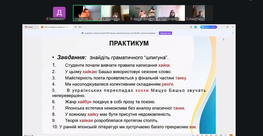 У межах лекції було ґрунтовно розглянуто історичні передумови формування хайку як самостійного жанру, його генетичний зв’язок із традицією ренґа, а також процес трансформації початкового тривірша хокку у завершену поетичну форму. Особливу увагу було приділено ролі класичних авторів у становленні канону хайку, зокрема творчості МацуоБасьо, у якій ця поетична форма набула глибокого філософського та естетичного звучання.