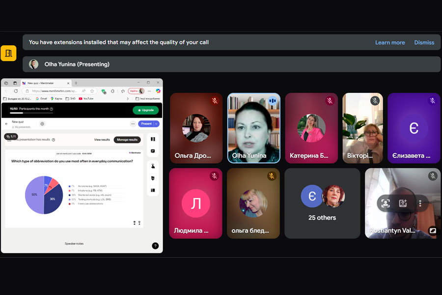 Здобувачі вищої освіти активно долучалися до обговорення, демонструючи високий рівень зацікавленості в тематиці лекції. У форматі інтерактивного діалогу вони розпізнавали скорочення в автентичних англомовних текстах, пояснювали їх значення та доречність вживання залежно від комунікативної ситуації, ділилися власними спостереженнями щодо адаптації таких одиниць у міжмовному просторі.