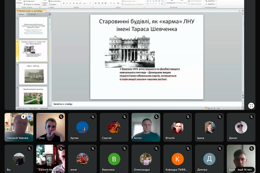 Нещодавно в Інституті гуманітарних та суспільних наук відбувся захід, приурочений до чергової, вже 103-ї річниці заснування Луганського національного університету імені Тараса Шевченка. Пам’ятна дата була згадана за допомогою «віртуальної екскурсії» для студентів Інституту старовинною будівлею колишнього Лубенського єпархіального училища, побудованого у 1907 році, де сьогодні розташовуються адміністрація та провідні структурні підрозділи Університету.