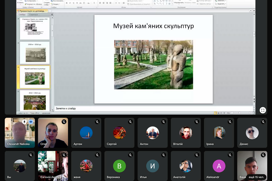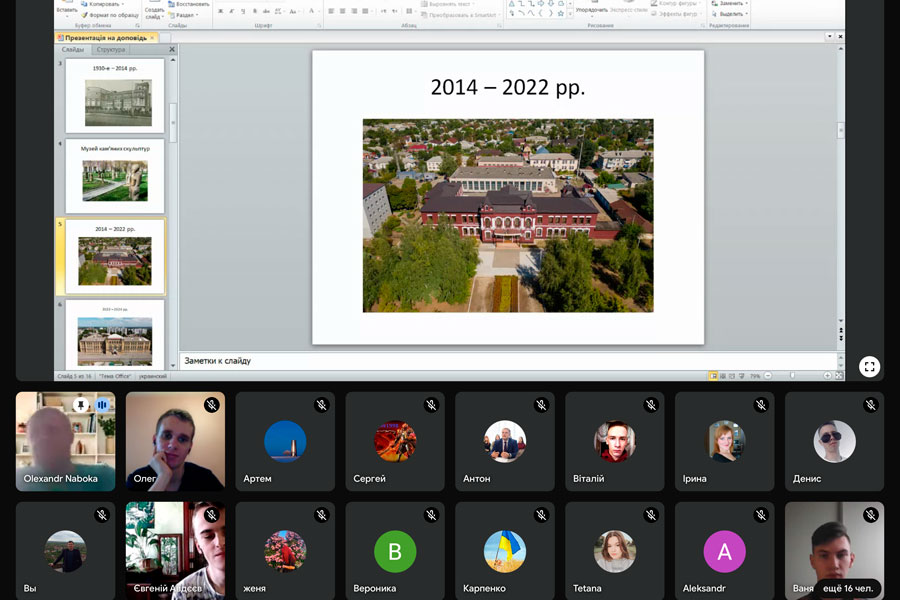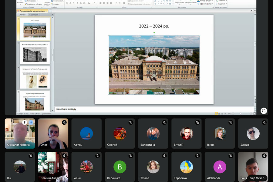 Головна ж увага доповідача була зосереджена на висвітленні історії сьогоднішньої, лубенської «гавані» нашого університету. Серед іншого, доповідач відзначив, що вона побудована у змішаному стилі пануючих наприкінці ХІХ – початку ХХ століть архітектурних стилях: неовізантійському каноні та модерн. Архітектором був Олексій Бекетов – пов'язаний родинними зв’язками із видатною родиною підприємців та меценатів Алчевських, яка системно підтримувала розвиток українською освіти та культури на Луганщині, на початку ХХ століття.