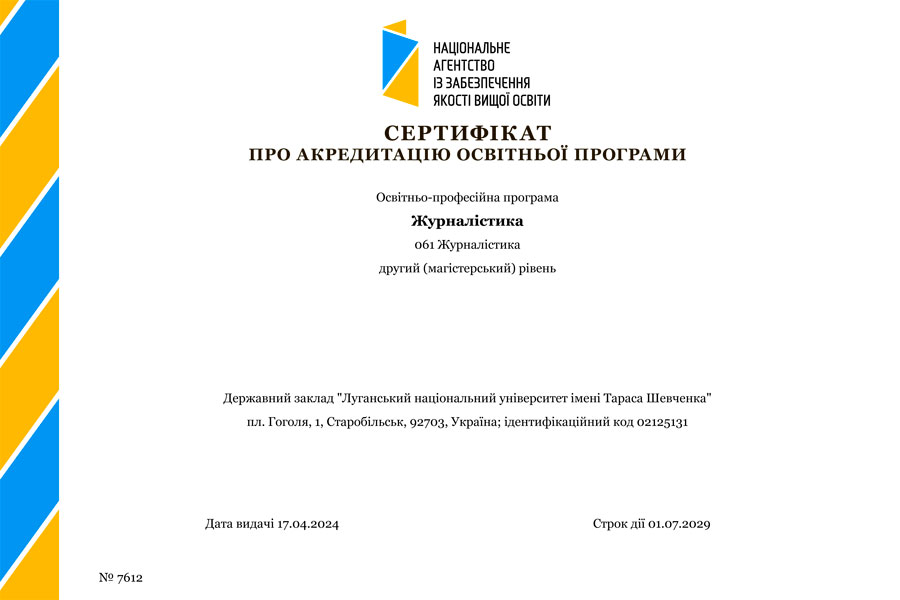 Кафедра журналістики пройшла усі етапи процедури акредитації освітньої програми та отримала сертифікат про акредитацію строком на 5 років.