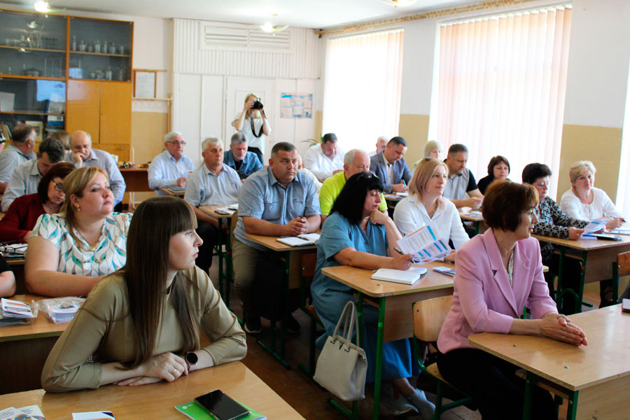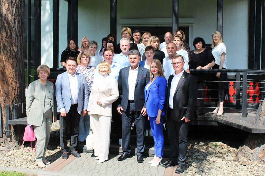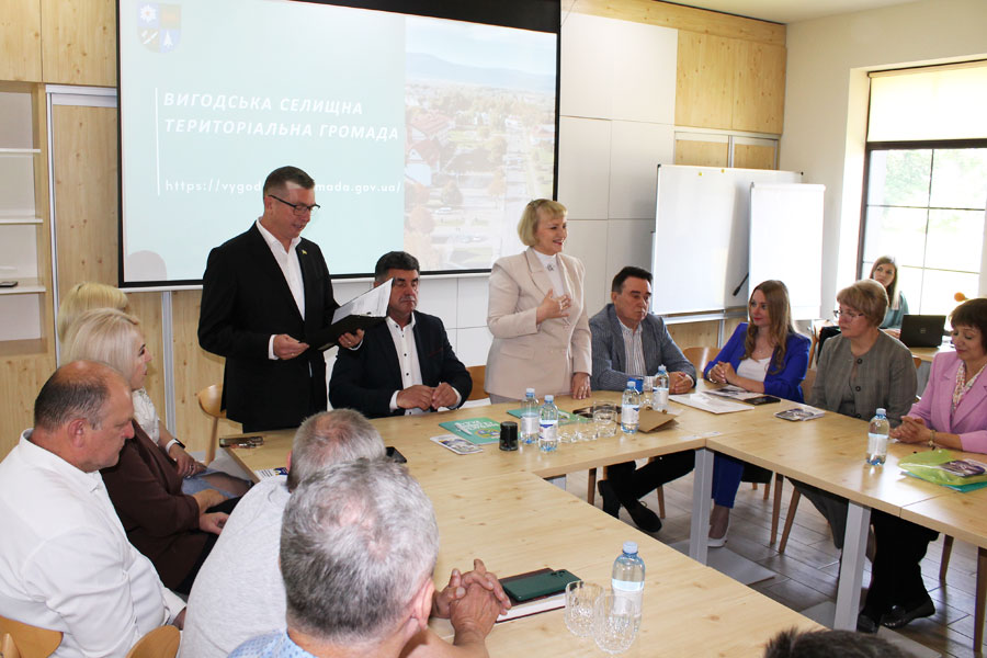 зустріч з головою Вигодської територіальної громади Миколою МАЦАЛАКОМ, заступницею голови з питань діяльності виконавчих органів Оксаною ДАНЧУК, начальником відділу освіти, молоді та спорту Вигодської селищної ради Віталієм ОЛІЙНИКОМ, головним спеціалістом сектору економічного розвитку, інвестицій та проєктної діяльності Тетяною НАСТАСЯК, керівниками і заступниками закладів загальної середньої та дошкільної освіти Вигодської територіальної громади;