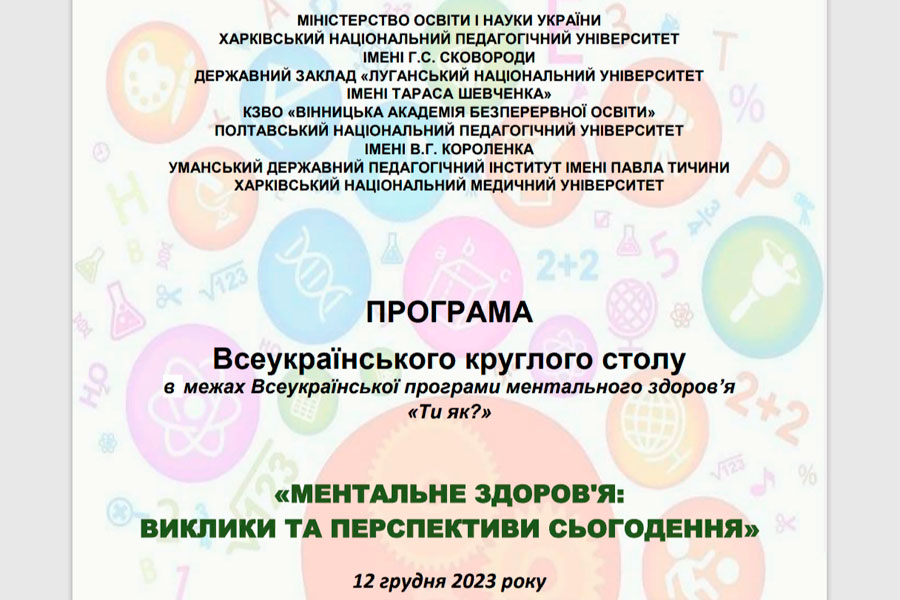 12 грудня 2023 року за участю Міністерства освіти і науки України та ініціативою Харківського національного педагогічного університету імені Г.С.Сковороди відбувся Всеукраїнський круглий стіл в межах Всеукраїнської програми ментального здоров’я «Ти як» на тему «МЕНТАЛЬНЕ ЗДОРОВЯ: ВИКЛИКИ ТА ПЕРСПЕКТИВИ СЬОГОДЕННЯ». Співорганізаторами заходу виступили: Державний заклад «Луганський національний університет імені Тараса Шевченка» (кафедра спеціальної освіти навчально-наукового інституту педагогіки і психології); КЗВО «Вінницька академія безперервної освіти»; Полтавський національний педагогічний університет імені В.Г.Короленка; Уманський державний педагогічний інститут імені Павла Тичини; Харківський національний медичний університет.