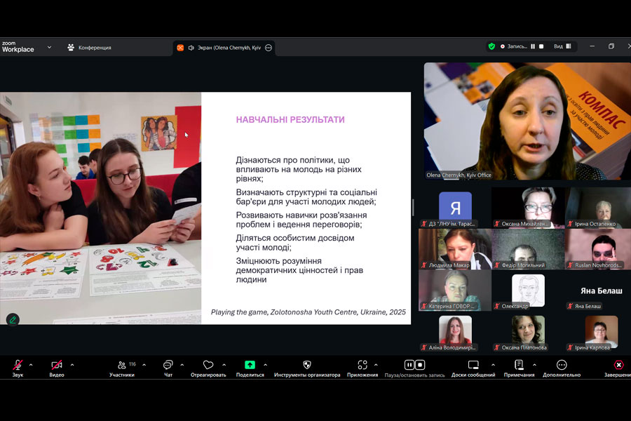 Спікеркою заходу виступила Олена ЧЕРНИХ, керівниця проєкту Ради Європи «Молодь за демократію в Україні: Фаза IV» (Офіс Ради Європи в Україні). Під час виступу учасники ознайомилися з освітніми ресурсами Ради Європи, програмами підтримки молоді, інструментами розвитку громадянських компетентностей, а також можливостями участі у міжнародних освітніх ініціативах.