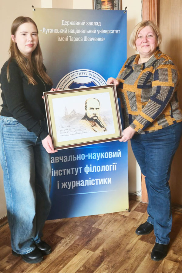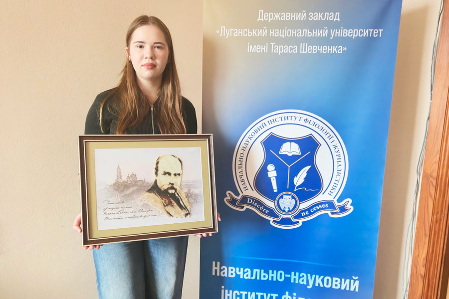 Не обійшлося й без подарунків. Завжди найбільш цінним є подарунок, виготовлений своїми руками. Саме такий подарунок ми отримали від Міхно Іванни, здобувачки освіти першого (бакалаврського) рівня, яка навчається за двома освітніми програмами (014.021 Середня освіта. Англійська мова та зарубіжна література та 014 Середня освіта. Образотворче мистецтво). Вона подарувала власноруч вишиту бісером картину, на якій Тарас Шевченко зображений на фоні його ж акварелі «Воздвиженський монастир у Полтаві».