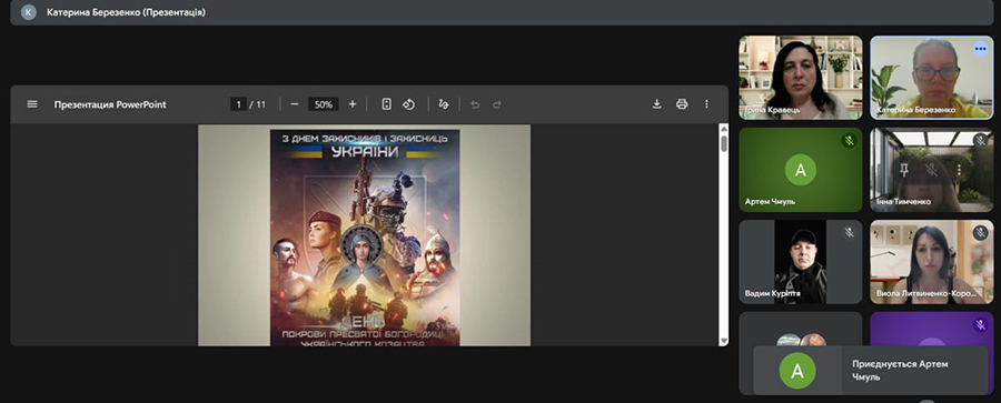 Учасники зустрічі згадали українських воїнів різних епох – від козаків до сучасних захисників і захисниць, які сьогодні на передовій відстоюють свободу та майбутнє України. Студенти та викладачі ознайомилися з історичними матеріалами Українського інституту національної пам’яті про традиції військової звитяги українців – від часів Київської Русі та козацької доби до воїнів Української революції, УПА та сучасних Збройних сил України.Особливу увагу було приділено історичному значенню Дня Захисників і Захисниць України, його тісному зв’язку з традиціями українського народу, зокрема з Днем Покрови Пресвятої Богородиці, а також із героїчними сторінками визвольних змагань різних поколінь українців. Студенти обговорили приклади мужності та самопожертви військовослужбовців, волонтерів та всіх громадян, які докладають зусиль для захисту України.