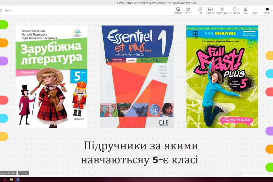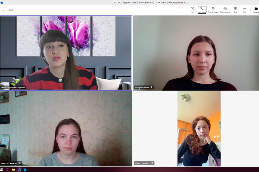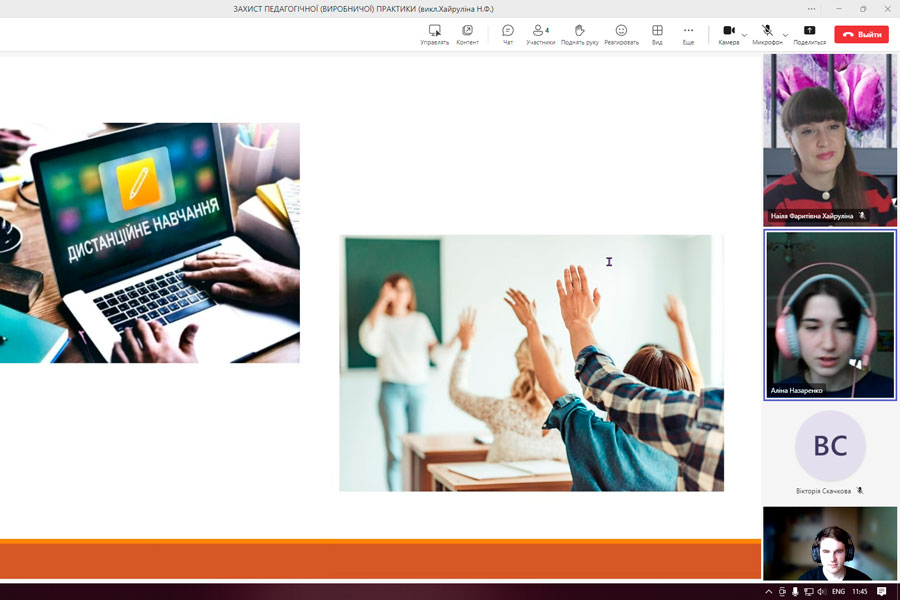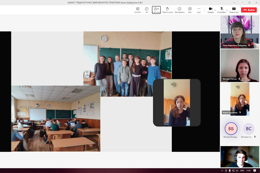 Під час захисту матеріалів педагогічної практики здобувачі поділилися враженнями від роботи з учнями середньої ланки, підготували короткі доповіді й презентації проведених уроків з іноземних мов та зарубіжної літератури, позакласних заходів. Деякі з них продемонстрували фрагменти проведених ними профорієнтаційних заходів і майстер-класів для учнів.