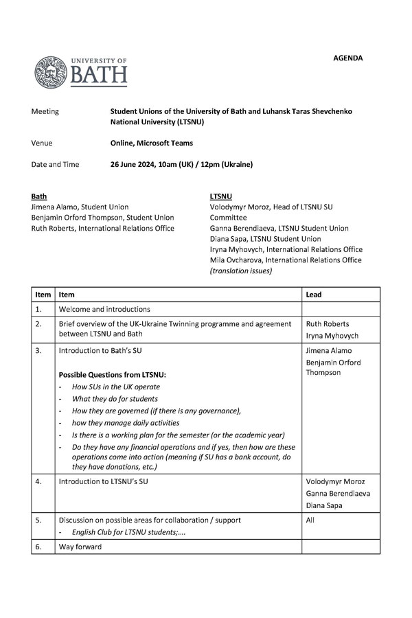 Взаємодія студентських об’єднань (профспілок) двох університетів є одним з вагомих пунктів реалізації стратегічного співробітництва нашого університету з Університетом Бата, графство Сомерсет, Великобританія, напрями якого окреслені у підписаній в 2022 році рамковій угоді про інституційне співробітництво (/assets/2022/11/mizch_diial_2022_11_uob-ltsnu_twinning_mou_signed_fr.pdf). Таке масштабне та різновекторне україно-британське партнерство за участі ЛНУ імені Тараса Шевченка здійснюється в рамках інтернаціонального проєкту «Twinning» за сприяння Cormack Consultancy Group в партнерстві з Асоціацією університетів Великобританії, мета якого підтримати українські заклади вищої освіти під час та після повномасштабного вторгнення в Україну шляхом встановлення довгострокових міцних партнерств з закладами вищої освіти Великої Британії та інших країн (координатор – Ірина В. МИГОВИЧ).
