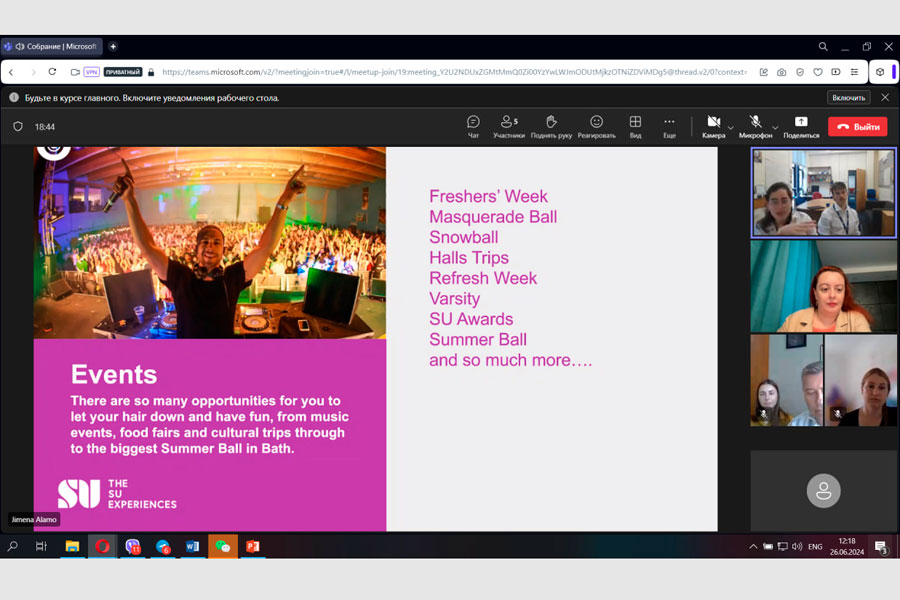 На зустрічі були присутні: начальник відділу міжнародних зв’язків, директор інституту міжнародної освіти Ірина МИГОВИЧ, координатор міжнародних зв’язків Університету Бата Рут РОБЕРТС (Ruth Roberts), голова ППО ЛНУ імені Тараса Шевченка Володимир МОРОЗ, провідні представники студентської спілки університету Ганна БЕРЕНДЯЄВА та Діана САПА; від студентського об’єднання Університету Бата були присутні президент Джимена Аламо (Jimena Alamo) та штатний співробітник Бенджамін Орфорд Томпсон (Benjamin Orford Thompson).