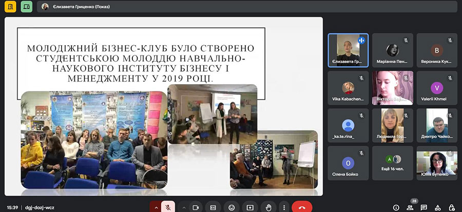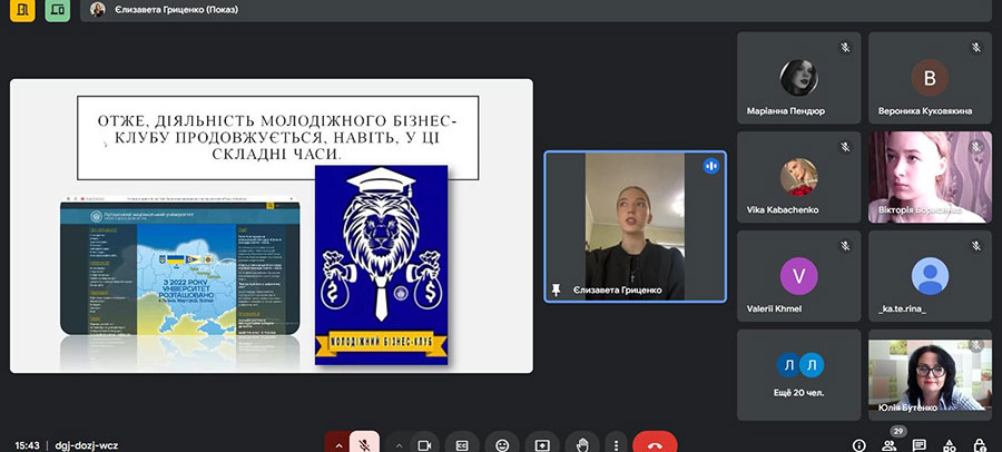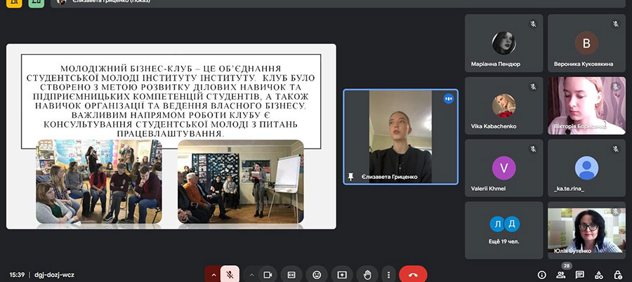 Продовжила зустріч голова МБК Єлизавета ГРИЦЕНКО , здобувачка вищої освіти 3 курсу спеціальності «Менеджмент». За допомогою презентації вона розповіла про історію створення та діяльності Молодіжного бізнес-клубу. Єлизавета Леонідівна наголосила, що важливим напрямом роботи клубу є консультування студентської молоді з питань працевлаштування.