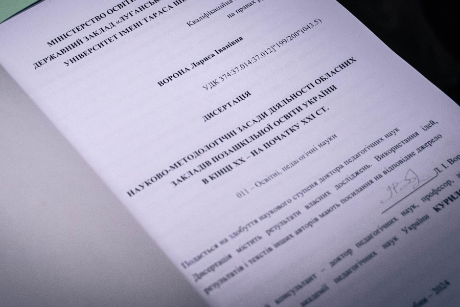 26 листопада 2024 р. на порядку денному була представлена докторська дисертація Ворони Лариси Іванівни на тему «Науково-методологічні засади діяльності обласних закладів позашкільної освіти України в кінці ХХ- на початку ХХІ ст.», поданої на здобуття наукового ступеня доктора педагогічних наук за спеціальністю 13.00.01 – загальна педагогіка та історія педагогіки