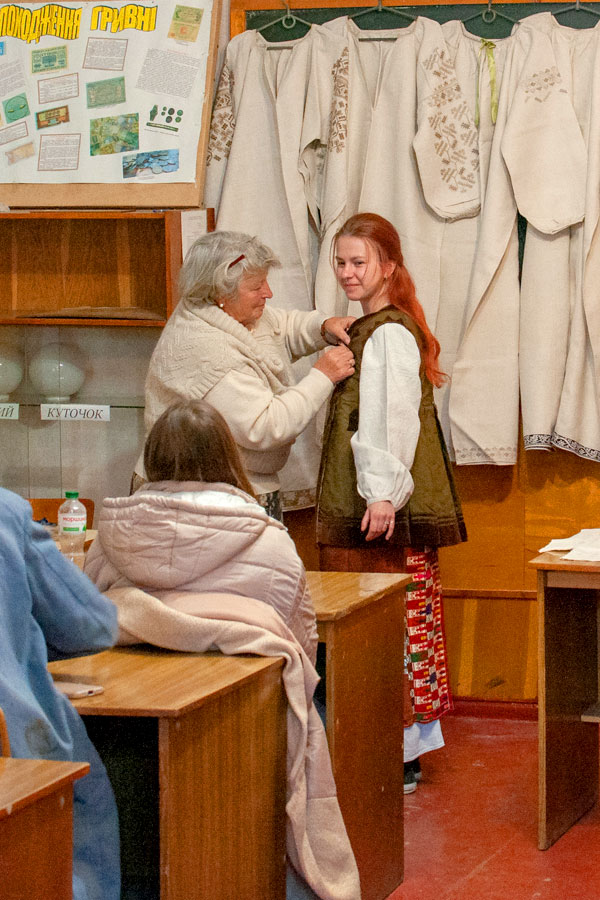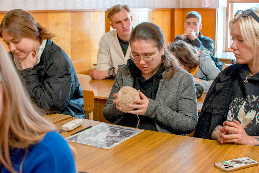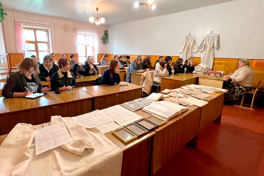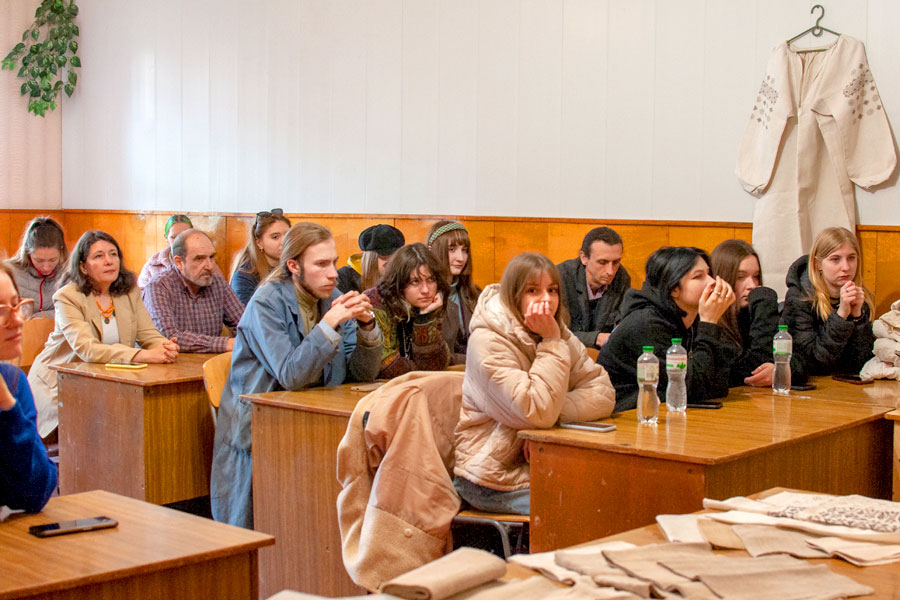 Тетяна Федорівна розповіла студентам про довгий шлях української сорочки від зерен льону та коноплі до готового виробу, представила автентичні сорочки, яких у неї ціла колекція.