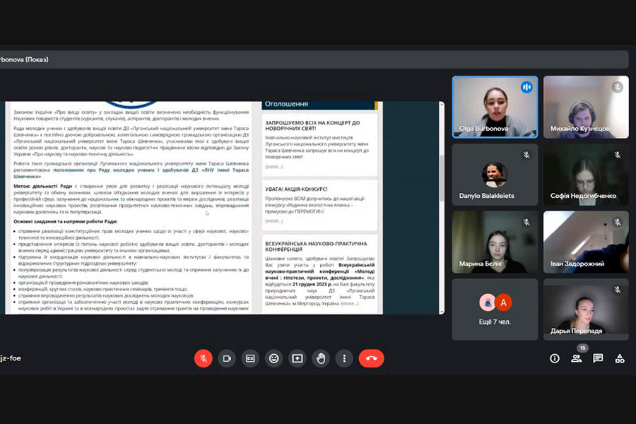 Пані Ольга ознайомила присутніх із особливостями діяльності Ради, її цілями та завданнями, а також розповіла про наукові конференції, які відбулися протягом останнього часу. Вона поставила акцент на важливості вироблення наукової культури серед здобувачів освіти і сприянні активному залученню їх до дослідницької роботи. Окрему увагу було приділено участі у неформальній освіті. Корінська О.О. провела екскурс по сайту університету та пояснила, як можна взяти участь у різноманітних заходах.