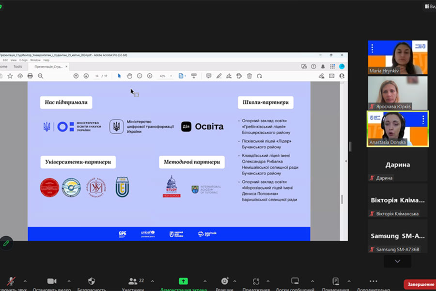 На онлайн зустрічі присутні дізналися, що з 2022 року команда ГО «Навчай для України» реалізує проєкт з подолання освітніх втрат «Освітній Суп» у співпраці із Міжнародною Академією Тьюторингу, яка є провідною інституцією в Україні щодо підготовки вчителів з тьюторськими компетенціями, та програму «СтудМентор», мета якої забезпечити рівні можливості для кожної дитини, незалежно від місця проживання.