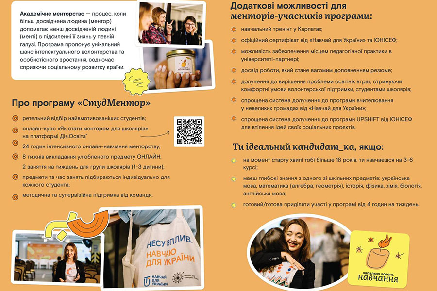 Якщо ти студент, що хоче підтримувати дітей знаннями, займаєшся чи плануєш займатися викладацькою/ менторською діяльністю — запрошуємо тебе на наш інтенсив, що допоможе тобі покращити твої уроки з дітьми з використанням менторського підходу.