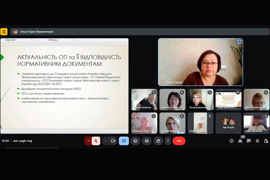 Зі ступним словом та побажанням плідної роботи до присутніх звернулася директор ННІПП, канд. пед. наук, доцент Марина Єпіхіна. Завідувач кафедри початкової освіти, канд. пед. наук, доцент Наталія Мордовцева продемонструвала зміни до програм, оновлений склад проєктної групи та стейкхолдерів, мету, предметну область та зміни, що відбулися в ОП. Гаранти ОП спонукали присутніх долучатися до обговорення програм та висловлювати пропозиції щодо їх удосконалення.