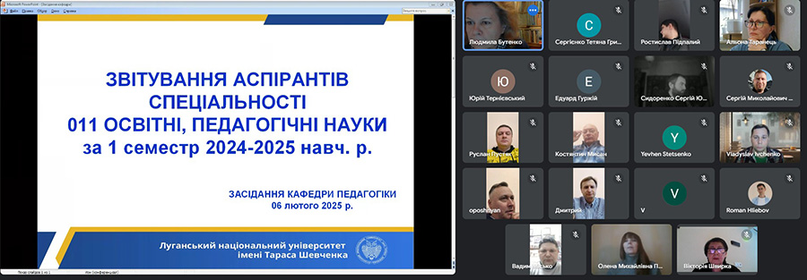 06 лютого 2025 р. на засіданні кафедри педагогіки ДЗ «Луганський національний університет імені Тараса Шевченка» відбулося звітування аспірантів 1-4 курсів спеціальності 011 Освітні, педагогічні науки за результатами виконання індивідуальних планів навчальної та наукової роботи за перше півріччя 2024-2025 навч. р.