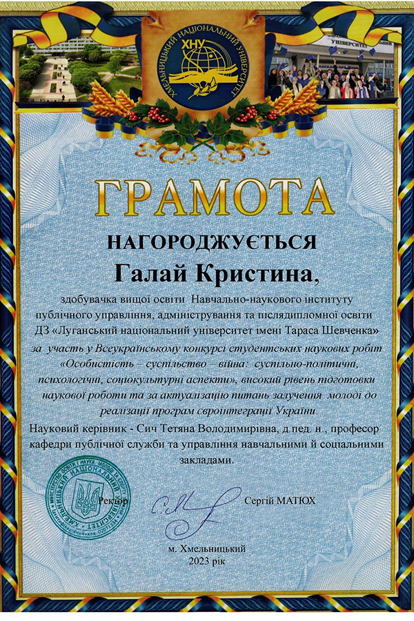 - April 2022 – July 2022 – Scientific Research Stay in Matej Bel University in Banska Bystrica, Slovak Republic, Department of English and American Studies, Faculty of Art. Research Study Theme: “The Development of Critical Thinking of Slovak Students in Comparison with Ukrainian Students in the Terms of Informational and Psychological Impact”,